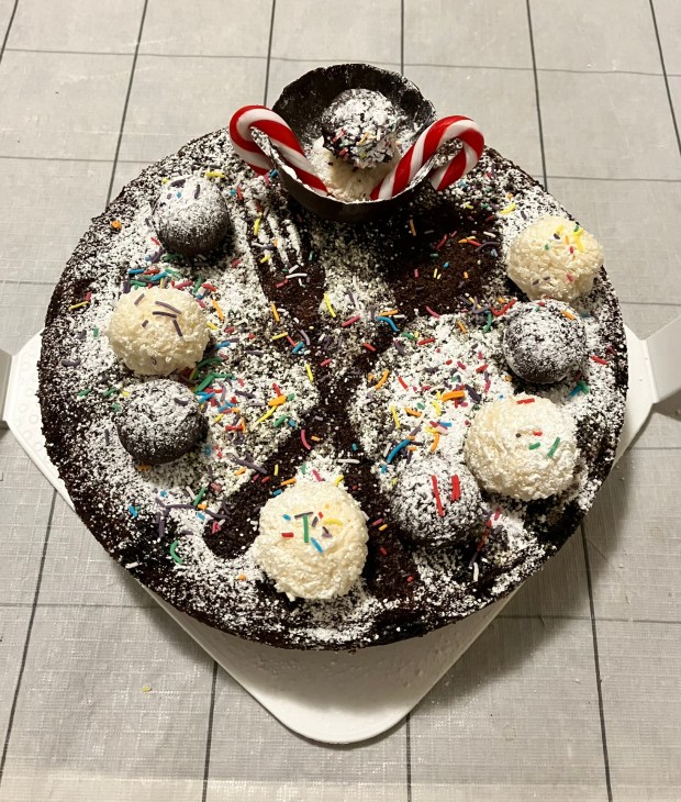 Once cake is completely cool down, transfer to plate or cake container plate mat. To decorate: place a spoon and fork cross over in the centre. Place chocolate cup on top in between the spoon and fork. Place one snow and top with chocolate ball inside the chocolate cup followed by candy canes opposite each other.