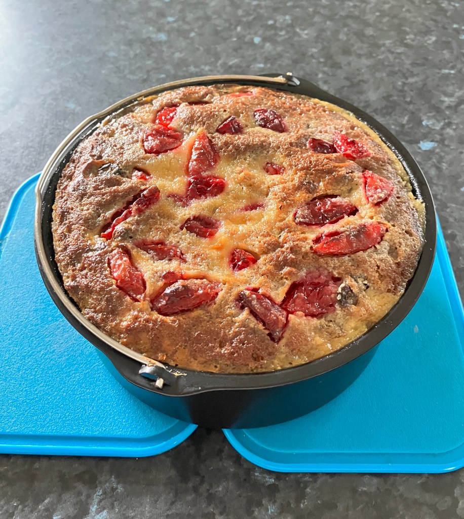 Greased 20 cm round air fryer pan and set aside. Using a serrated knife, cut the panettone roughly into 1cm / ½ inch thick, place the bottom part of panettone at the bottom of prepared pan. Scatter some bite size cherry plums over the top. Drizzle 2 Tbs water over the panettone.  Panettone is fabulously soft and mouldable, so this isn’t a hard job.