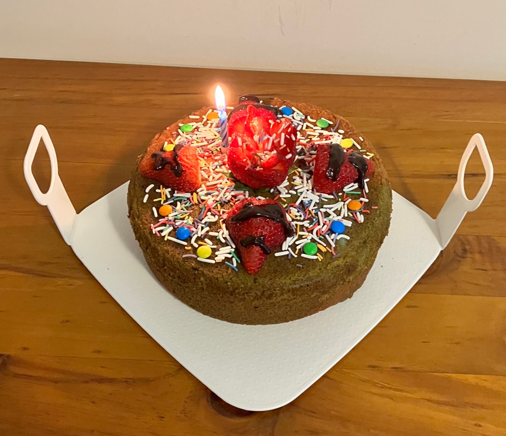 Bake this cake for my sister’s birthday celebration yesterday. I surprise everyone with the combination of coffee, pumpkin spice, and matcha. Addition, I melt some leftover circle design and dome moulds dark chocolate that is in the freezer for almost a year. It’s a birthday cake needed more sparling colours so, in goes the leftover m & m smarties, white and colourful sprinkles too.