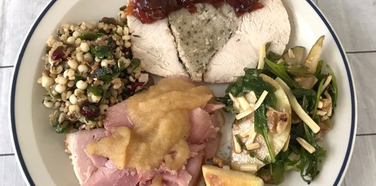 To assemble: Bring out both the salads to room temperature. Place kale couscous on the centre left corner, on top place stuffed turkey rolled, at the bottom place some leftovers hams, followed by 2 potatoes and on the center right place the leftovers pear salad. Spoon cranberry jelly on to turkey and apple sauce on to the ham. Enjoy!!!