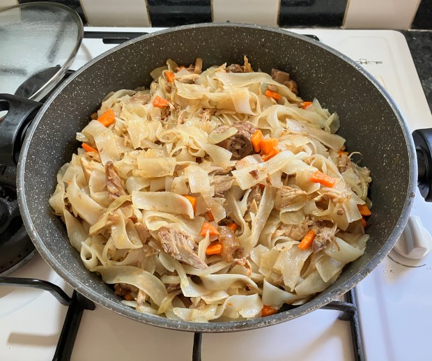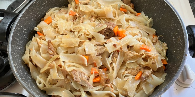 Next add 1 Tbs oil and minced garlic in the same saucepan, stir cook for about 30 seconds then add turkey meat cook for about 3 minutes. Add seasoning sauce, salt, pepper, koay teow strips and 1/4 c chicken stock, and cooked vegetables. Continue to stir fry for 2-3 minutes or until noodles turn soft or no longer wet.