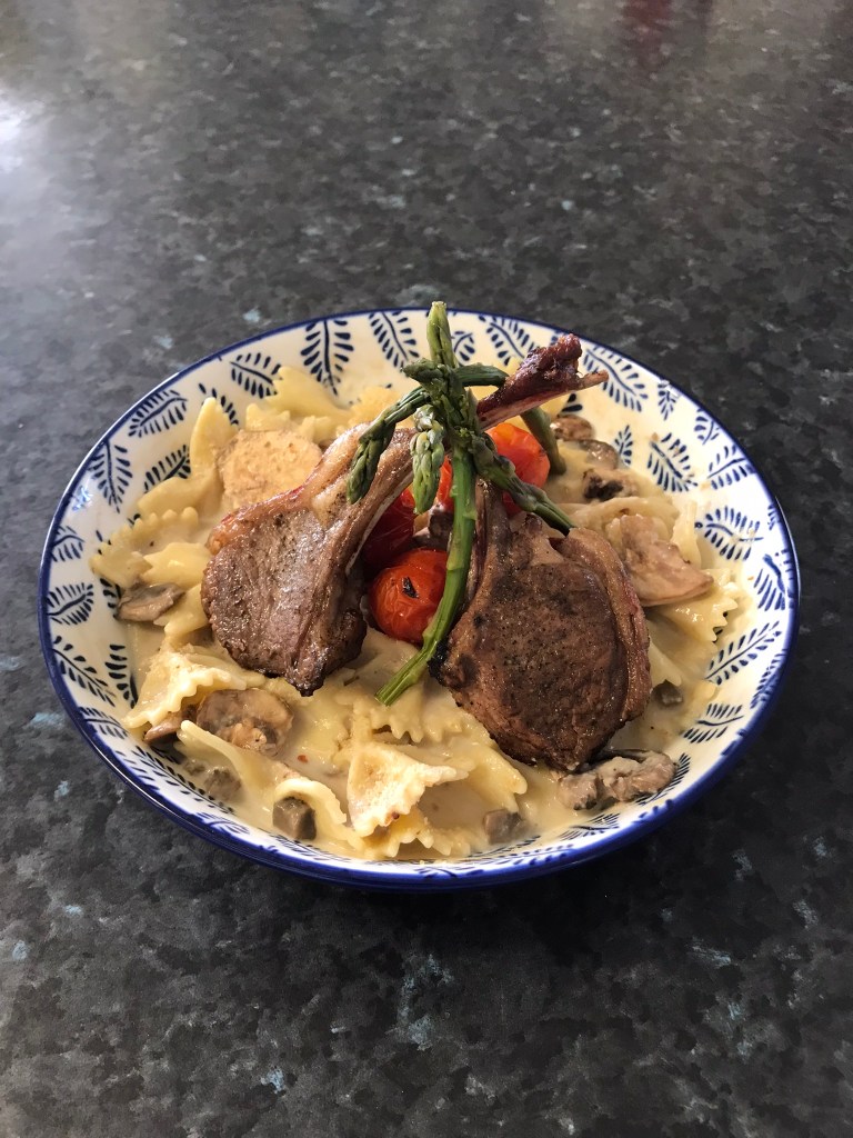 Meanwhile, cook pasta according to instruction on packet, to your taste. Drain well and add cooked pasta to mushroom sauce and toss to combine, adding a little pasta water if needed to have extra sauce. Check seasoning. Spoon pasta onto bowls. Place the cherry tomatoes in the center. Next remove the foil, place the lamb on top resting on each other with the cherry tomato to help stand up. Followed by the asparagus leaning on the rack of lamb. Enjoy with a glass of wine!!!