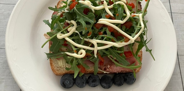 Put turkey and ham on a plate, warm up in microwave and cover with cling wrap. Once done, bring out from microwave and set aside. Spread butter on bread. Then place turkey and ham on top of buttered bread. Followed by rocket. Squirt mayonnaise and the squirt chili sauce that is a must for me. Garnish with blueberries. Enjoy!!!