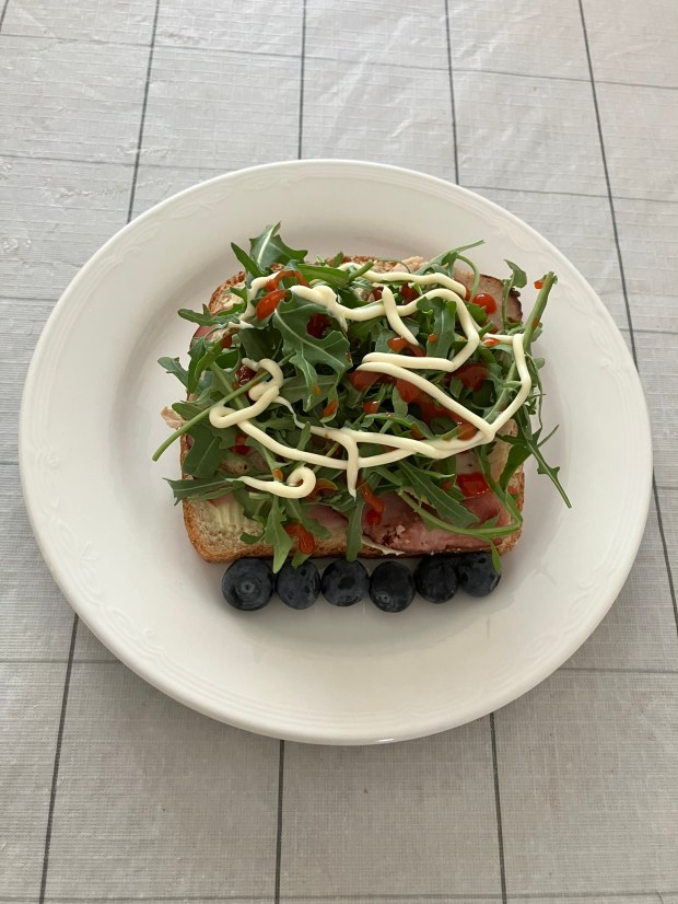 Using my leftovers turkey, ham and blueberries from Christmas festive. Got rocket, bread, chili sauce and mayonnaise. For my New Year Day breakfast, I am having something old, and new food.