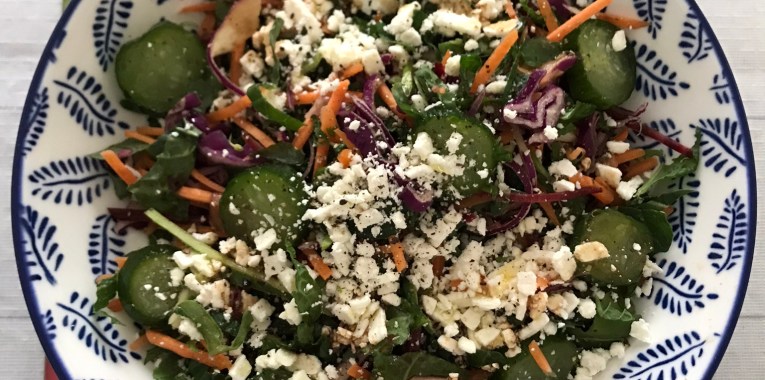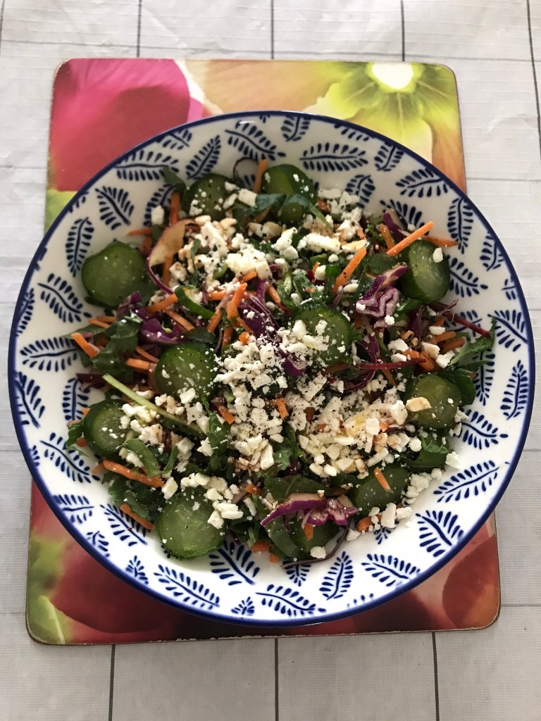 “It’s important to work with cold cheese, so it’s firmer and easier to crumble.” I use my hands to crumble the goat cheese straight onto mixed vinaigrette salad. Serve immediate. Enjoy eating healthy!!!!