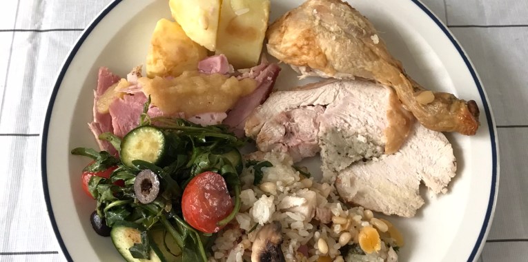I have added leftover salad after microwaving the meat and rice. Addition to it I have some apple sauce over my ham. I can only share my roast chicken with turkey rice stuffing. I have added the link of my salad tapenade recipe below. You got to make your own turkey and ham. Let’s eat!!!