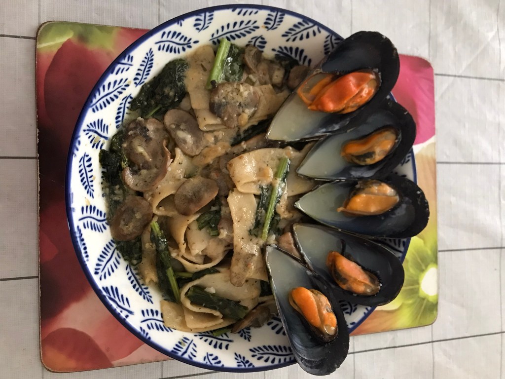 Found this picture again, after about 1 year, and I know it got to be somewhere. Anyway, I am glad to be able to write up and post it. My sister’s friends came to visit her, and they went to the pier, bought some mussels and my sister gave me some. I had intended to just have pappardelle, mushrooms and kale that I got it on sale.