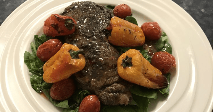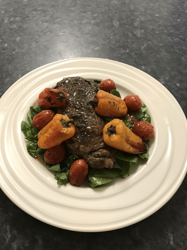 Baked for about 10-14 minutes or to your liking. Halfway turn steak, cherry tomatoes and sweet capsicums. Once cooked, off the oven and let it rest for 5 minutes with oven door open little bit by placing a wooden spoon.