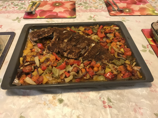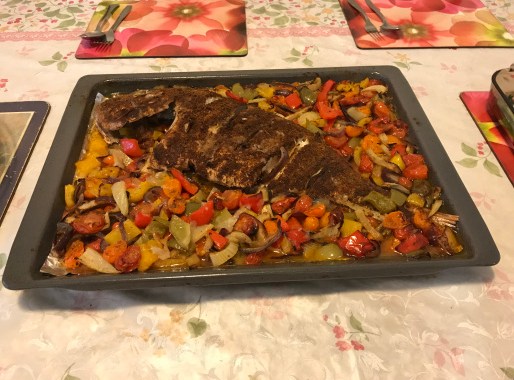 Place baking tray on the lowest oven rack. Roast for 28-30 minutes until snapper and vegetables are cooked through; charred slightly snapper. Serve it straight from oven in baking tray and I squeeze juice from lemon I stuff in the snapper using tong all over it before spooning to individual plate. Serve it with rice, broccoli, and shredded chicken my mom made, and my dad bought sweet and sour spare ribs.