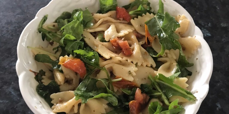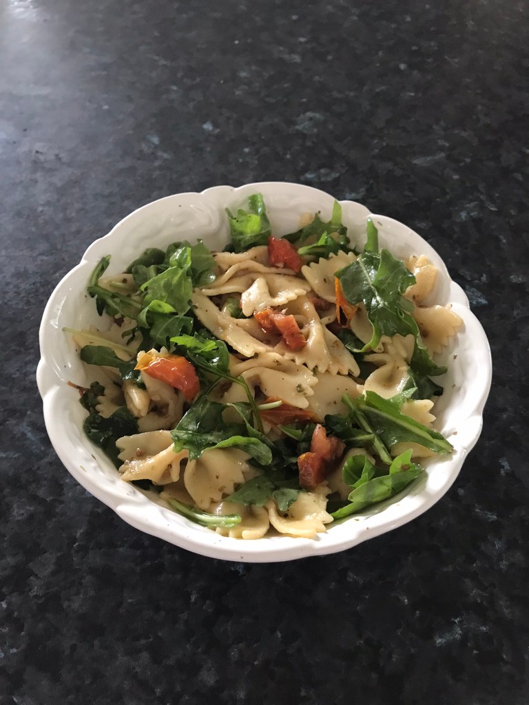 Wash and dry salad with paper towel or if you have the salad drying equipment, that’s good. Spoon 2 Tbs of semi dried tomatoes with oil into a small pasta bowl add salad and the drain bow tie pasta. Toss to mix well. Then add another 2 Tbs semi dried tomatoes with oil on top. Serve immediately with a glass of orange juice. Enjoy!!!!