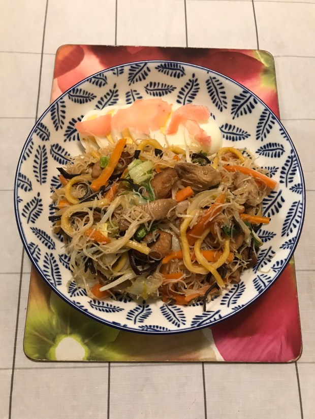 Next add another 1 Tbs of oil into the wok over high heat, add pork with the marinade in until cooked and pour in about 2 ladles chicken stock. Once cooked, pour corn flour mixture into the chicken stock and simmer until the gravy thickens. Pour back carrots, Chinese cabbage, black fungus and Hokkien noodles and stir well to warm up again. Next add vermicelli and winter vegetables stir toss for about 2 minutes or until noodles turn soft and not wet. Add bean sprouts; mix well for about 1 minutes until bean sprouts are cooked. Check the seasoning. Spoon some onto a bowl. Bring out the cooled sliced egg and lined them at the top of the noodles. Garnish some ginger pickled. Enjoy with a glass of white wine!!!
