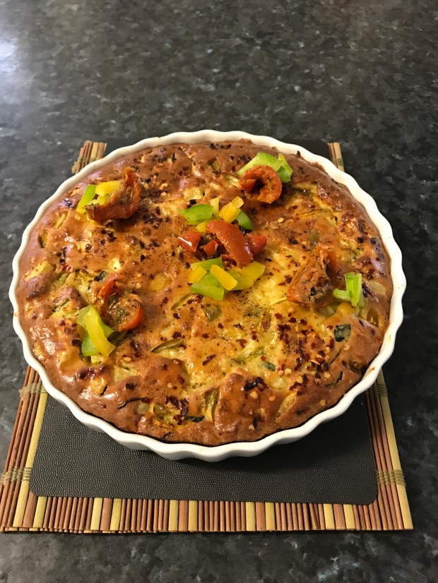 Bake for 40-45 minutes or until firm and golden brown. Cool in dish 15 minutes before garnish with sundried tomatoes and capsicums. Then slice into wedges and serve with simple salad and a glass of white wine. Enjoy!!!!!