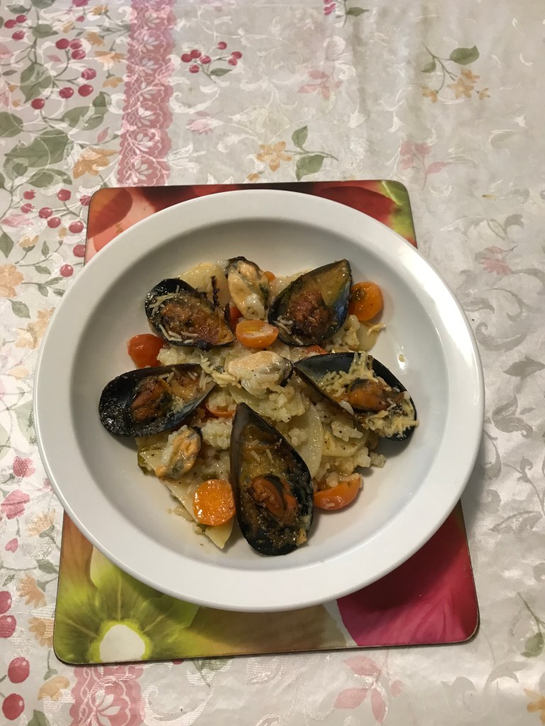 In time like Corona Virus, my sister managed to get me some mussels. I have recreated from Silvia Colloca with what I have at home. The flavour combinations are fresh sea, sweet-tangy with fruity flavoured cheese and a peppery after-taste as well as a sharp, salty-flavoured cheese at the end of taste bud. It’s a hearty comfort and delicious meal.