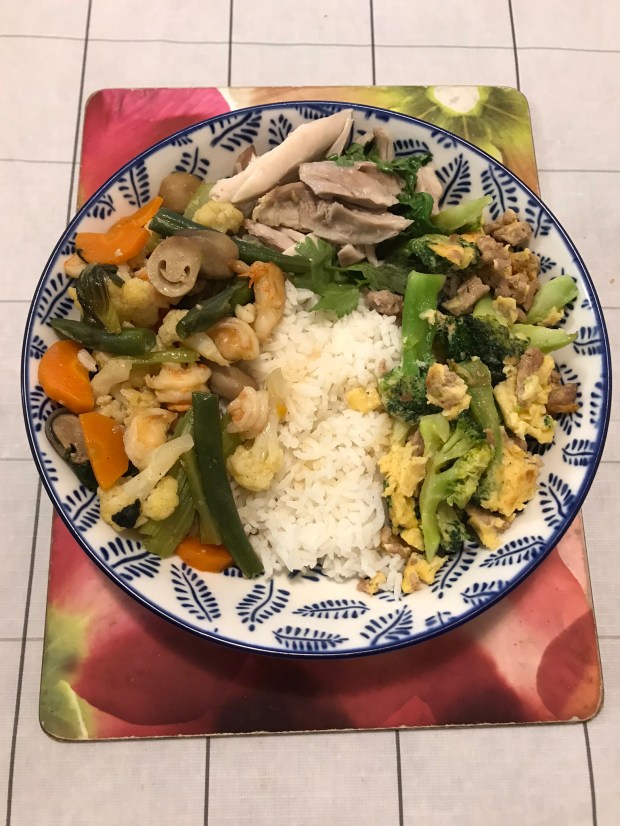 Most of my Asian culinary food are in big portions; I always freeze and label date and name them. As I was clearing my freezer, I discovered I have some Drumstick chicken pieces with coriander and Minced pork egg broccoli leftovers. Best use it with my mixed vegetables with prawns.