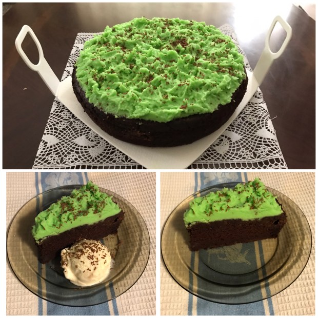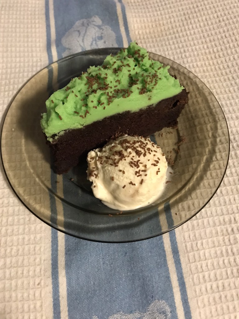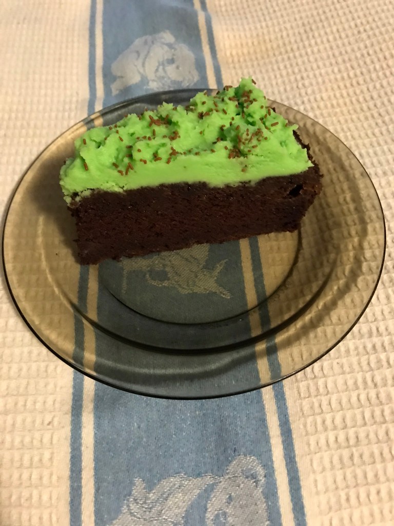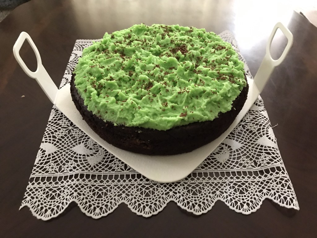 Just before serving cake about 1 hour, bring out ganache, beat it again with a tiny drop of green colour like cream until thickened, double in size. Spoon a big dollop of ganache in the middle and spread out all around the top of cake with a butter knife and make some design. Sprinkles chocolate sprinkles around the ganache. Cut and serve on its own or with ice cream or tea or coffee or dessert wine. Enjoy!!!!!