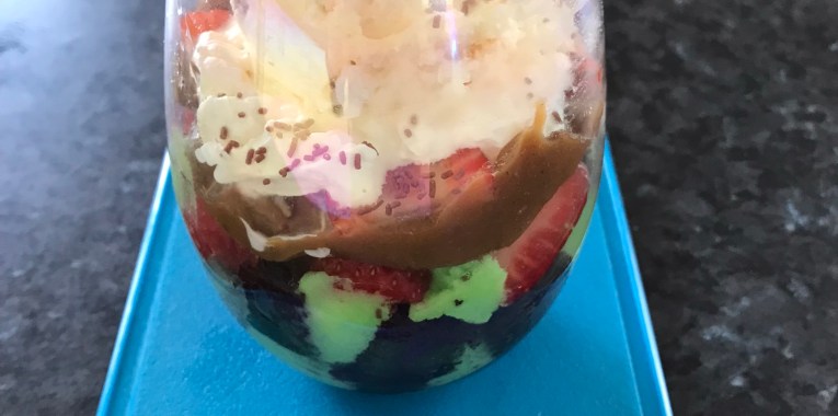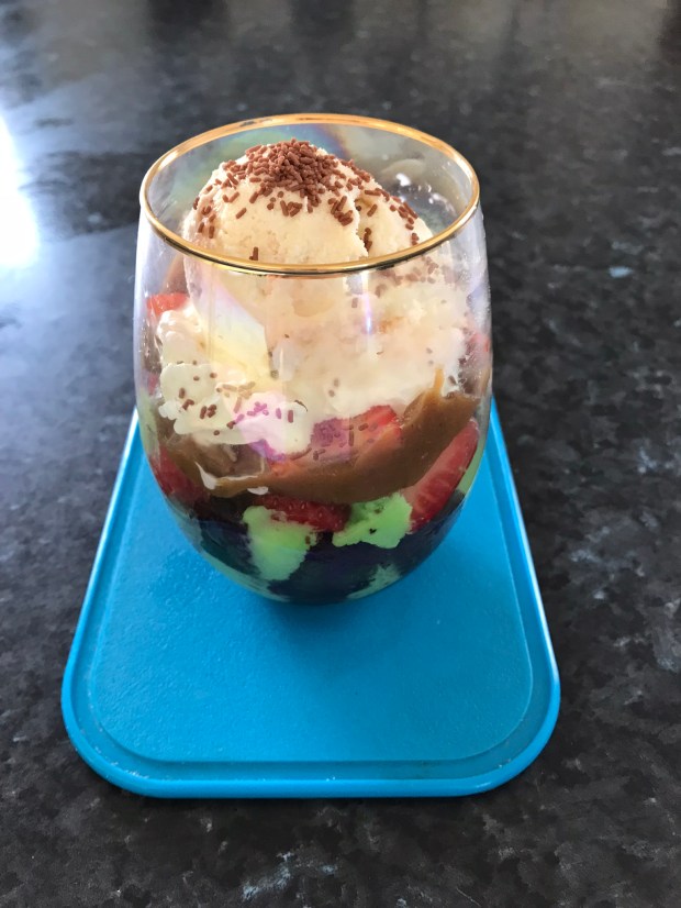 With leftover a few pieces of the Zucchini chocolate cake with sprinkles chocolate and ganache. I am turning it into pudding with all leftovers of strawberries, cream, salted caramel and ice cream. Then garnish with chocolate sprinkles.