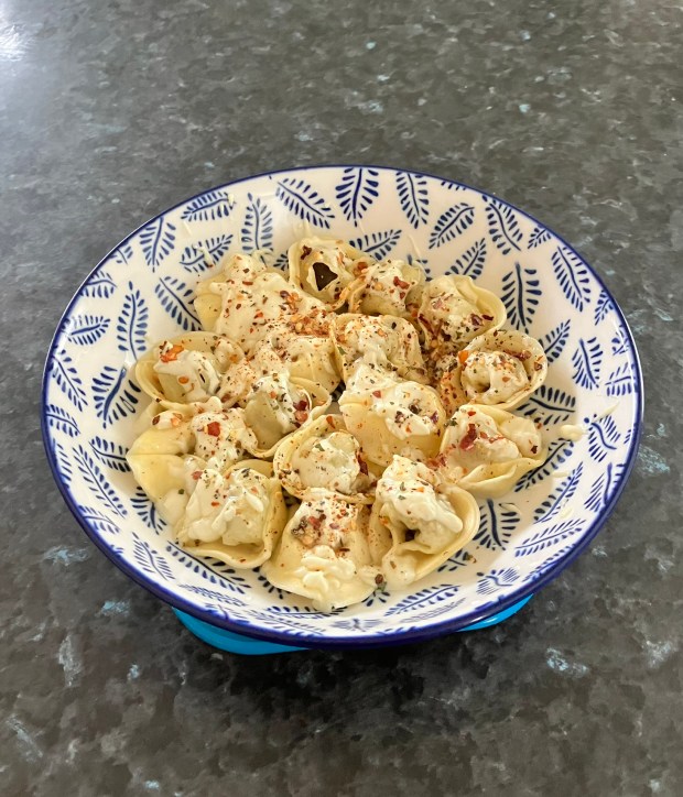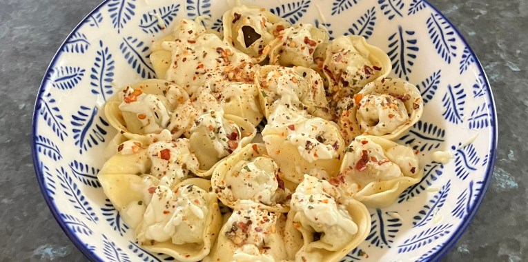 Dollop the carbonara cream over the tortellini. Scatter some Italian Seasoning and chili flakes. Enjoy with a glass of white wine.