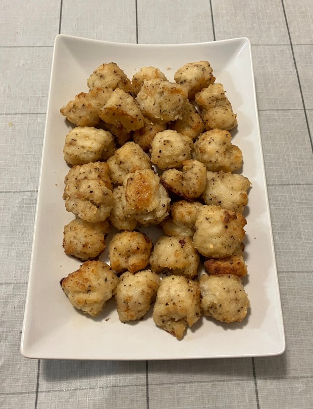 Bring out the cup, carefully place the baking tray inside the cup and put back the cup into the machine. Air fry for 4–5 minutes. Bring out the cup, then flip, spray with more oil, and cook for another 3–5 minutes until golden brown and crispy. Do not overcook.
