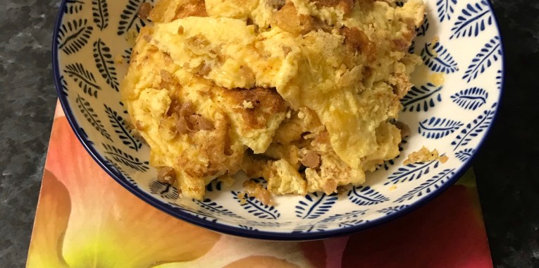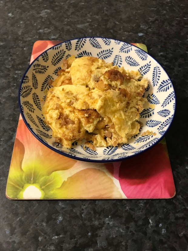 Then pour the egg mixture into it. Swirl the egg around saucepan and wait for the bottom to set and turn golden brown, cooking for about 2–3 minutes. Flip it over, and continue to cook for another 30 seconds to 2 minutes. Use a spatula to break the egg into a few large pieces, then dish out and serve immediately with rice and a side vegetable dish. Enjoy with a cup of green tea!!!