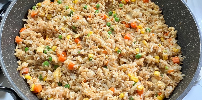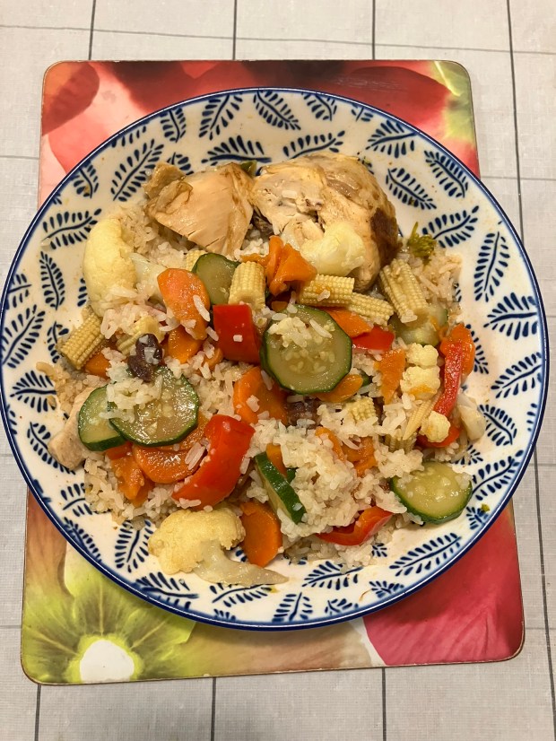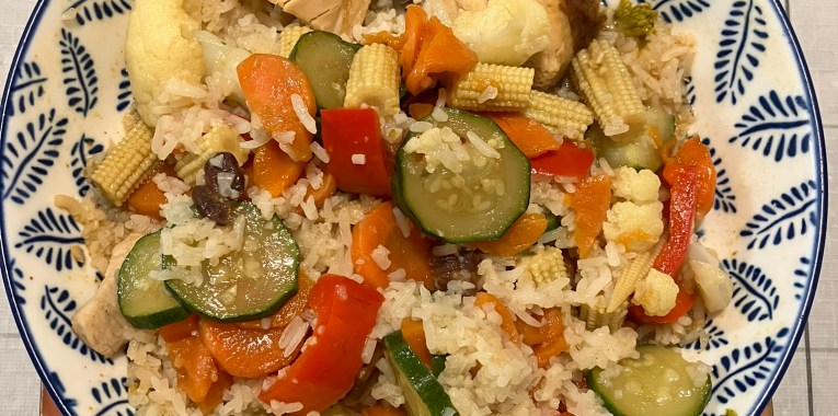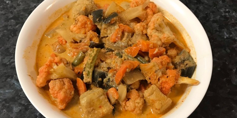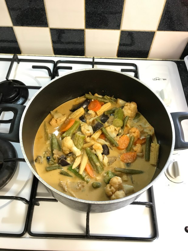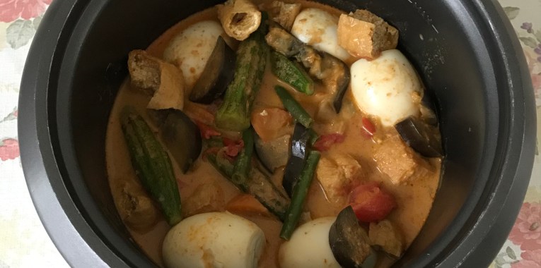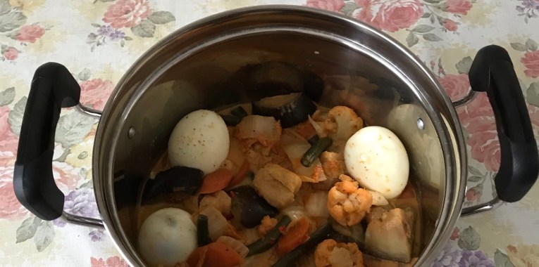 Chicken and potato curry A1 Action one hard boiled egg vegetables and prawns with rice