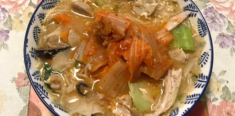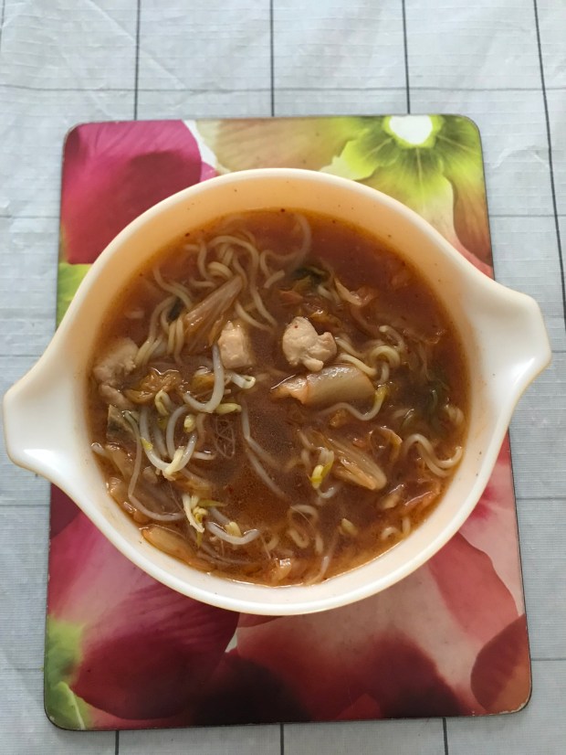 Shin ram yun chicken pieces pumpkin and cabbage noodle soup