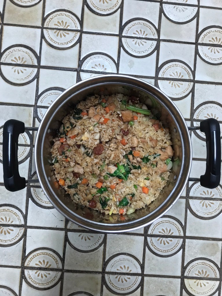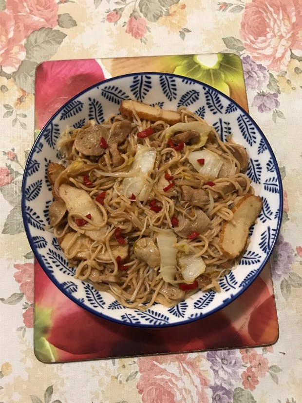 Chow mein stewed pork chicken fried preserved turnip egg and vegetables