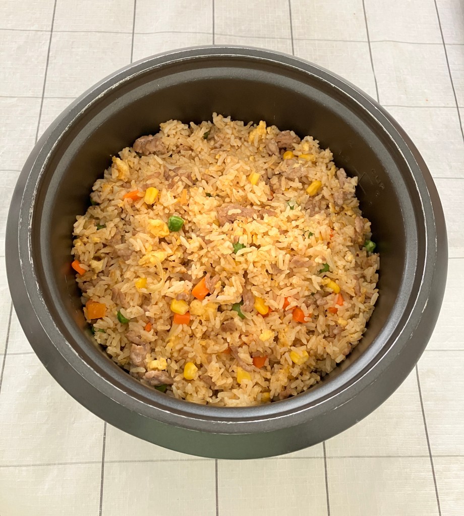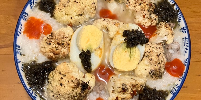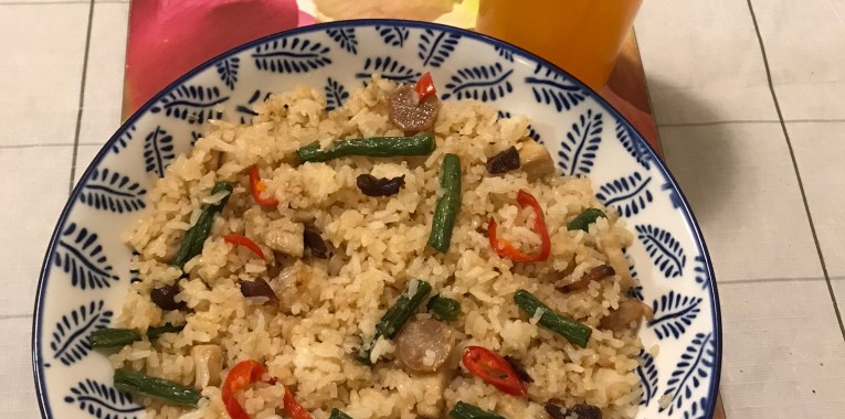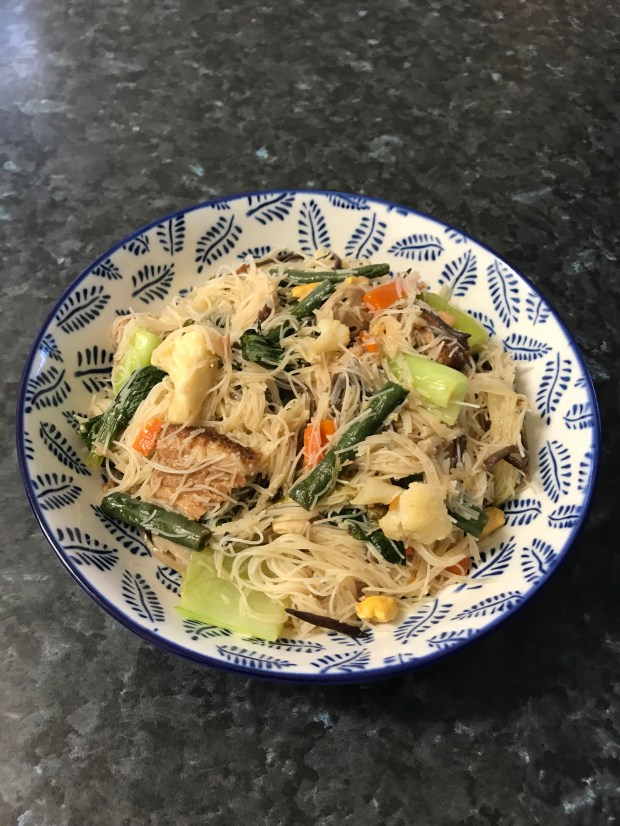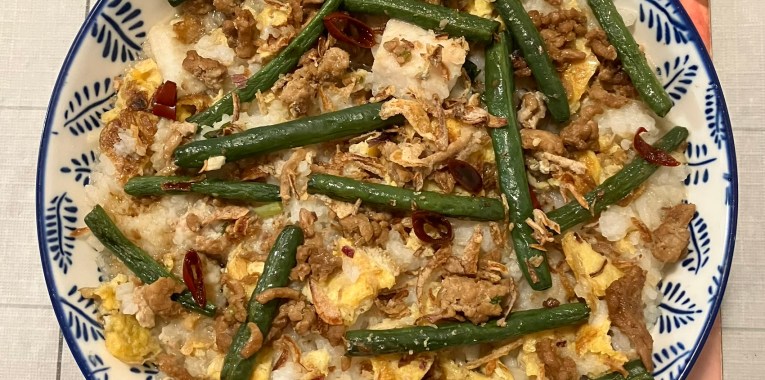 Fried egg vermicelli noodles char chee yoke minced pork and vegetables with preserved olive leaves and vegetables
