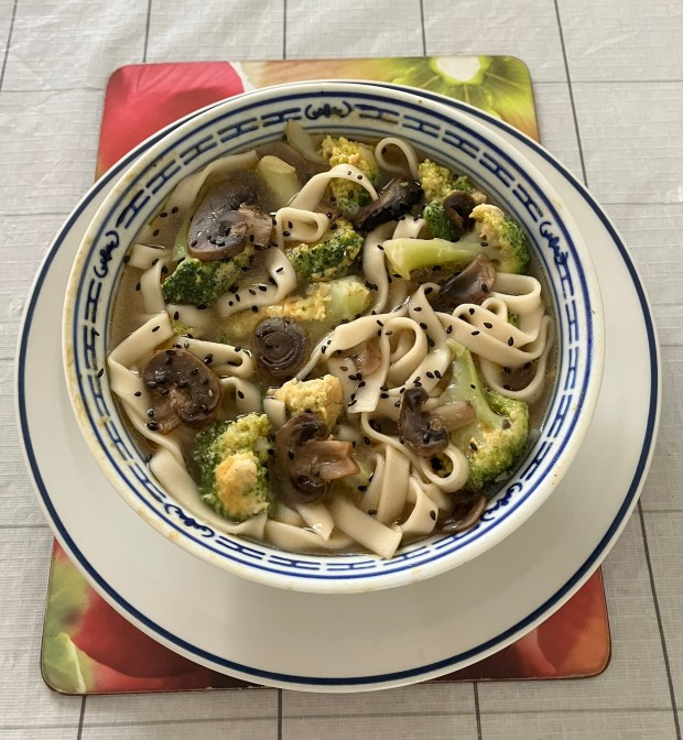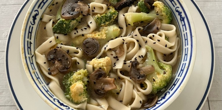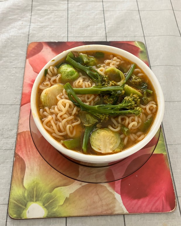 Shin ram yun noodles soup with Brussels sprouts and broccolini
