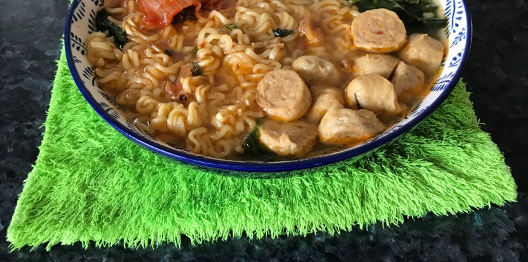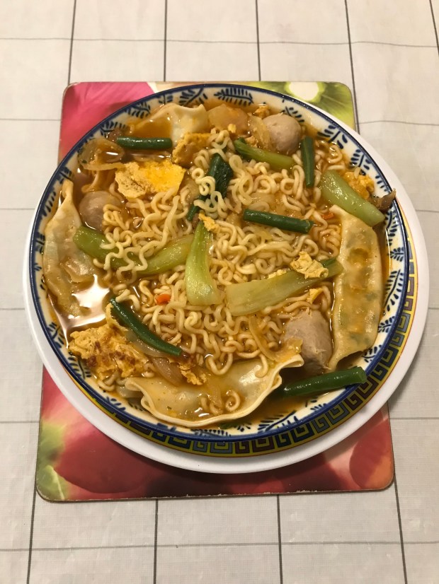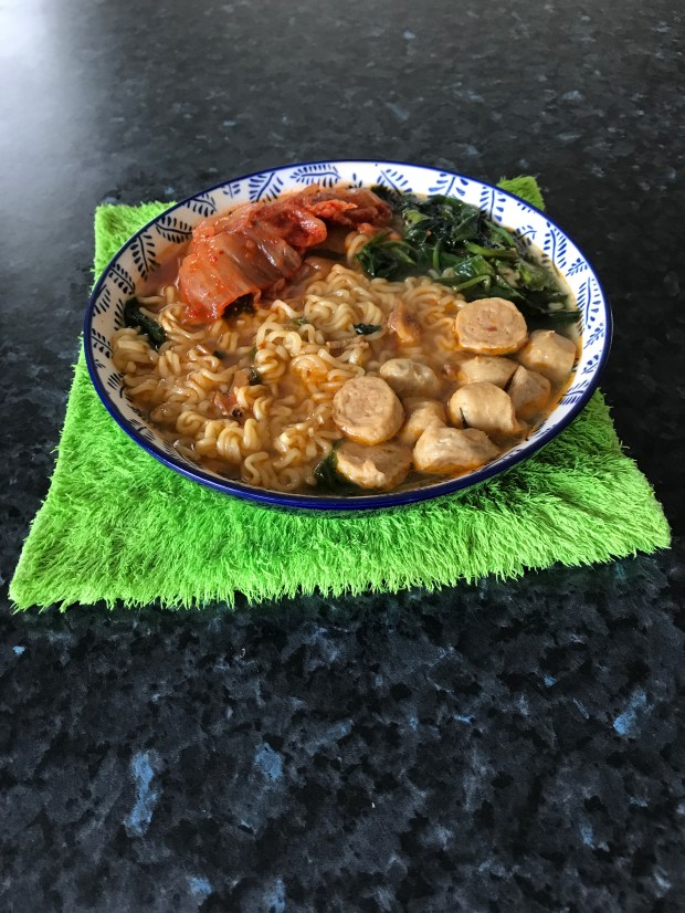 Shin ram yun kin tok kin pork balls buk choy noodle soup