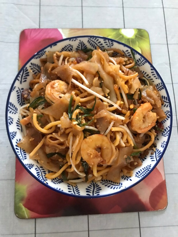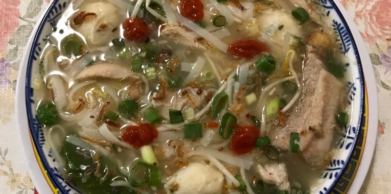 Koay teow and bee hoon noodles in prawn and chicken flavoured soup