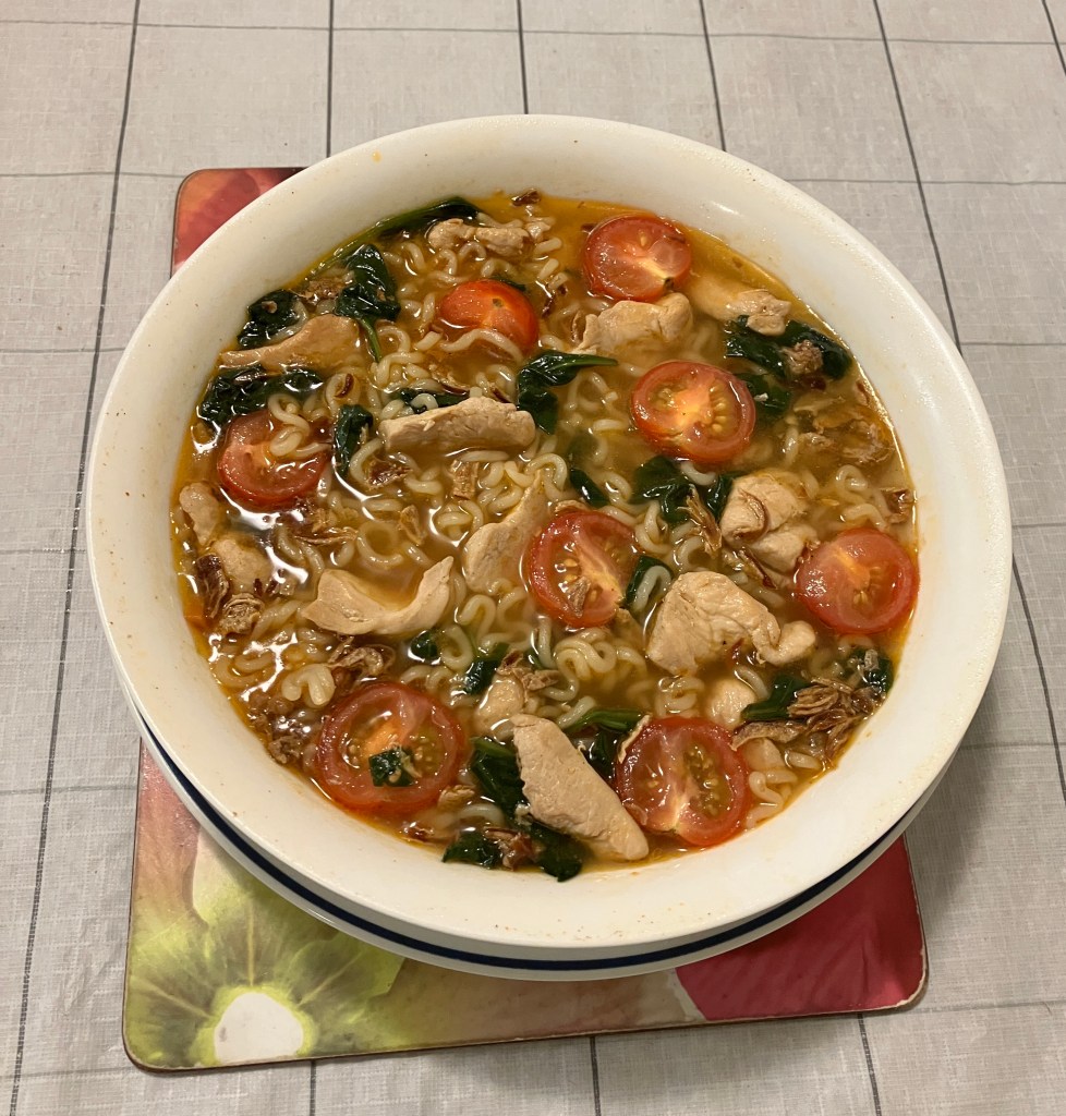 Shin ram yun noodles soup daikon baby spinach and chicken wing