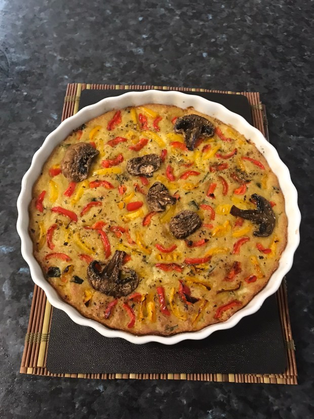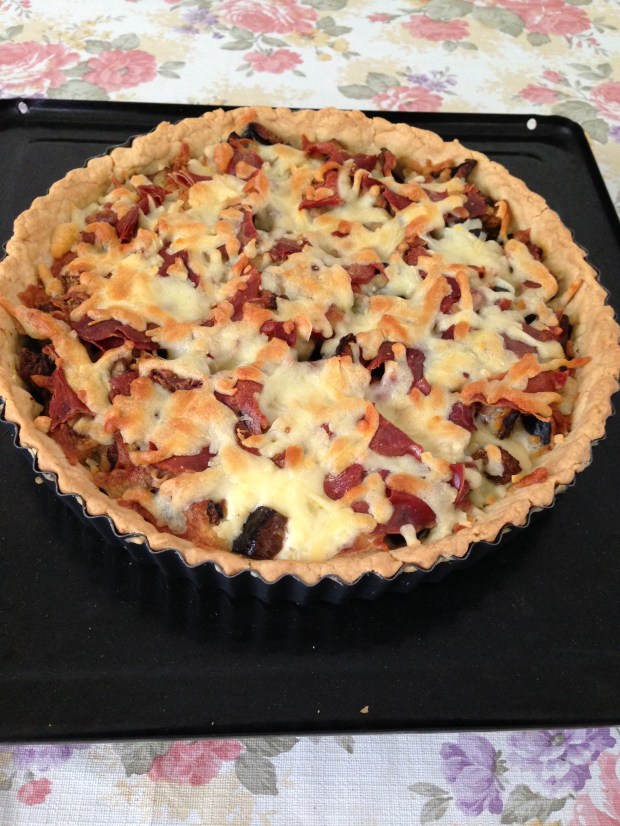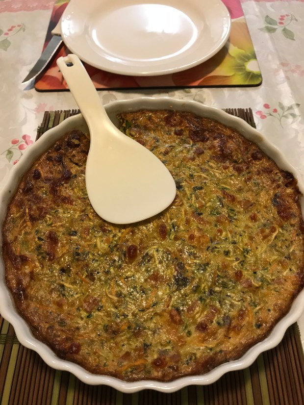 Helen’s bacon and vegetables quiche with chilli flakes serve with salad