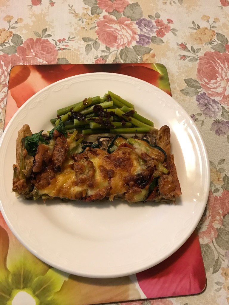 Garlic sticks Parmesan tart with spinach mushrooms and sundried tomatoes
