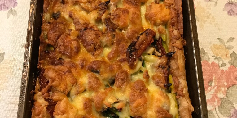 Garlic sticks Parmesan tart with spinach mushrooms and sundried tomatoes