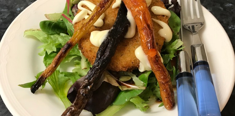 Chicken burger on a bed of salads baked mushrooms potatoes and cherries